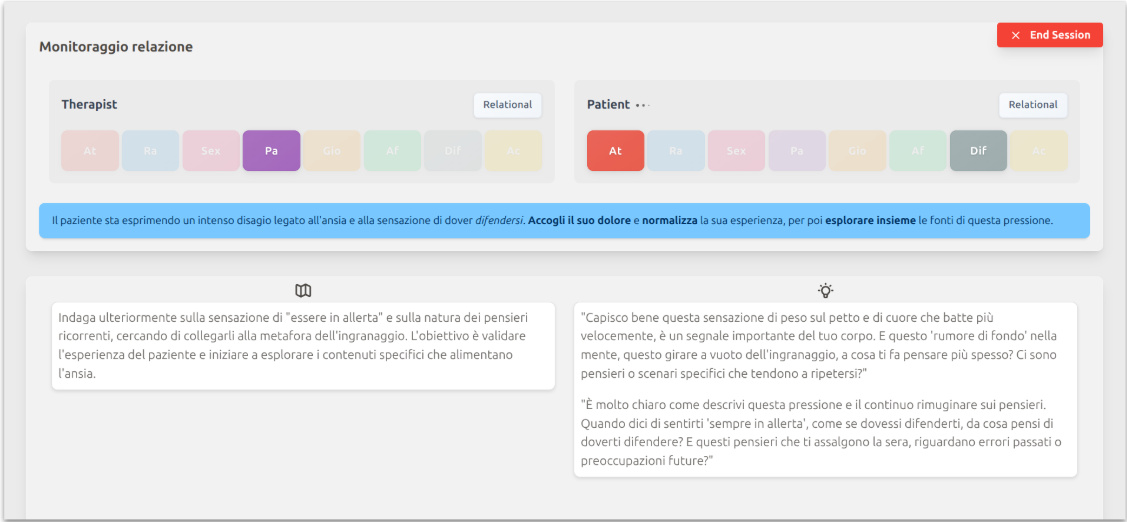 Monitors therapeutic alliance and detects alliance ruptures as they happen, using computational implementations of scientifically-grounded cognitive and evolutionary theories. When detecting a misattunement between the therapist's relational stance and the patient's interpersonal needs, it generates a discreet alert.